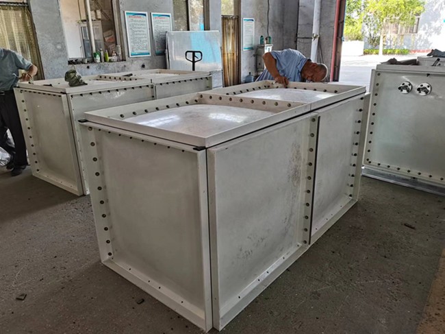 1、內襯層水(shuǐ)箱內表麵為富樹脂層,其(qí)厚度為1.5mm,表麵應光滑平整,不允許有痕,色(sè)調均勻,水箱邊緣整齊(qí)、厚度均勻、無分層、加工斷麵應加封樹脂。材料(liào)選用無堿玻(bō)璃(lí)纖維氈和短切氈(zhān),因為水箱所儲水為生活用水,不得有汙染,故選用耐水性能(néng)優良的食品不飽和樹脂,並(bìng)且還要固化。
